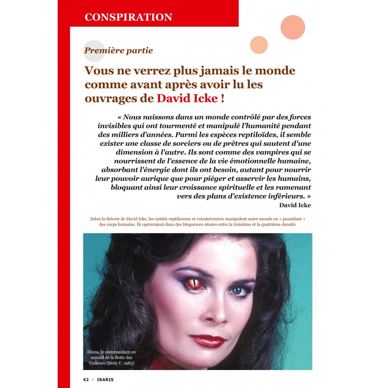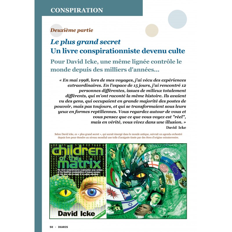 Beaucoup l’ont surnommé « l’homme le plus conspirationniste de la planète ». David Icke écrit des ouvrages sulfureux sur ce qu’il pense être la véritable nature de notre monde et sur ceux qui le contrôlent. Il parle de lignées sanguines cachées à travers lesquelles des entités issues d'autres dimensions vivent et opèrent de façon invisible parmi nous. Il affirme aussi que des familles de pouvoir (comme des dirigeants royaux, politiques et économiques) sont issues de familles royales qui ont régné il y a des milliers d’années.