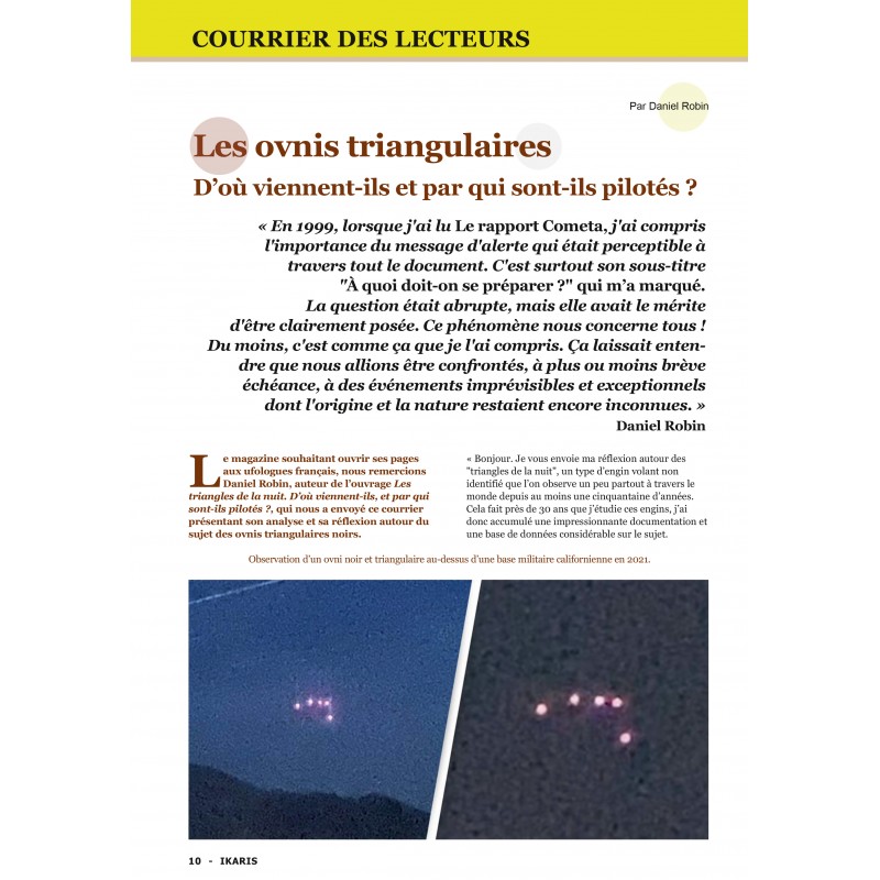 Les ovnis triangulaires noirs sont parmi les phénomènes aériens non identifiés les plus intrigants signalés ces dernières décennies. Daniel Robin a consacré tout un ouvrage à ces objets, posant des questions troublantes : pourquoi ces engins semblent-ils nous observer ? Pourquoi maintenant ? Ces triangles noirs sont-ils des sentinelles silencieuses, des prototypes furtifs ou le fruit de notre imagination collective ? Le mystère reste entier… mais les témoignages, eux, continuent d’affluer.