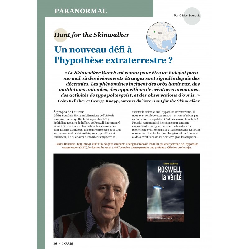 Gildas Bourdais était un écrivain et ufologue français passionné par le phénomène des ovnis. Il est surtout connu pour ses travaux sur l’affaire de Roswell, mais il s’est aussi intéressé à des cas plus récents et troublants, comme celui du ranch Skinwalker dans l’Utah (États-Unis). Après avoir traduit le livre Hunt for the Skinwalker de Colm Kelleher et George Knapp en français, il en avait tiré une réflexion personnelle autour de l’hypothèse extraterrestre.