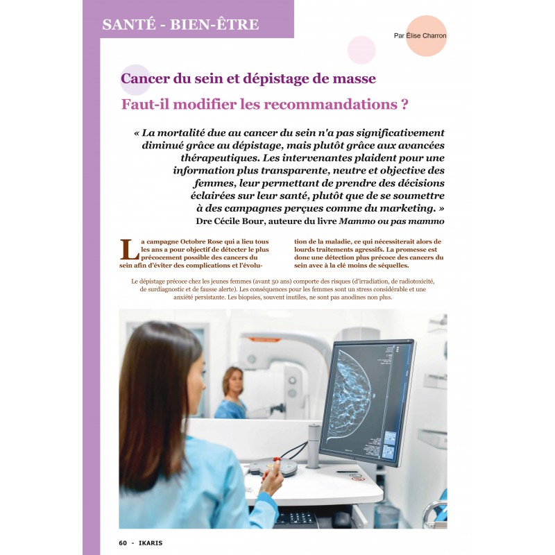 Depuis trois décennies, on conjure les femmes à se faire dépister. L’objectif des plans cancer est d’arriver à 70% de participation. S’il est utile pour prévenir de nombreux cancers, les chiffres montrent que pour le cancer du sein, il y a matière à s’interroger, car faire ce dépistage implique de savoir à quoi on s’engage. Au lieu d'évaluer l’intérêt des programmes de dépistage sur le taux de la participation, on devrait plutôt le faire sur la base des décisions prises dans un contexte éclairé.